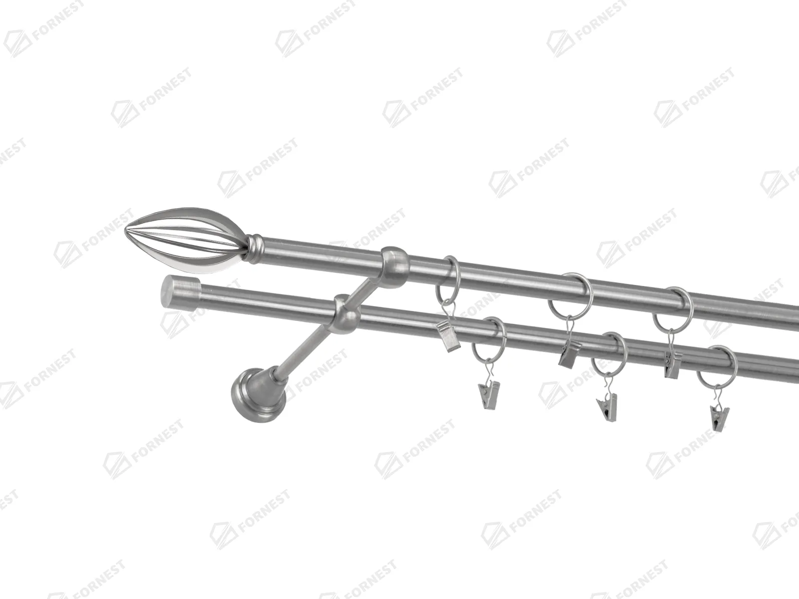 Dvojradová garniža s povrchovou úpravou - odtieň satin-nikel (matné striebro). Celokovové garniže s kvalitnou povrchovou úpravou - galvanické pokovovanie. Galvanické pokovovanie zabezpečuje vyššiu povrchovú tvrdosť, zvýšenú dolnosť voči poškriabaniu, hladký povrch. Dodávané sú v kompletoch.