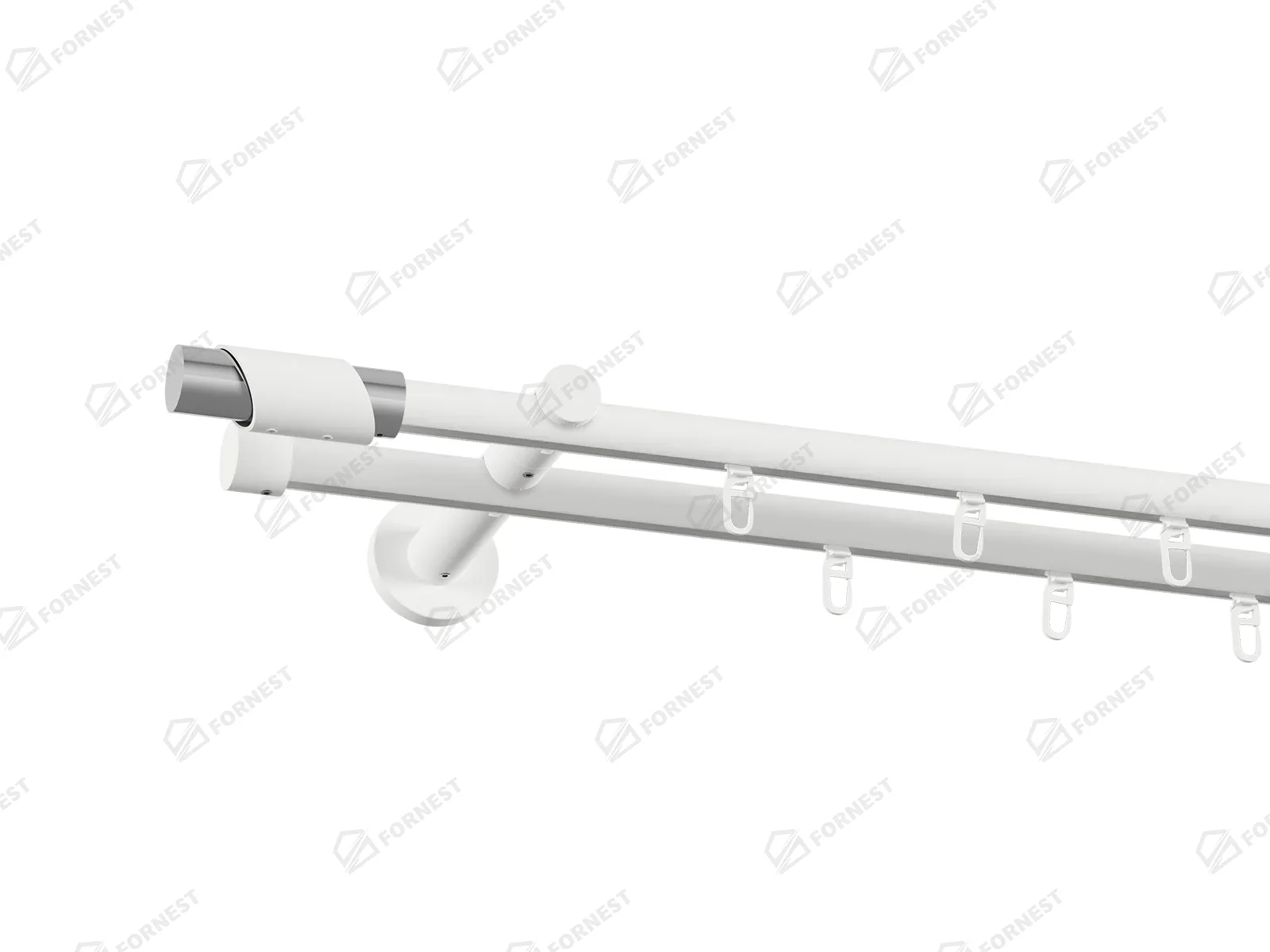 Dĺžka 1600 mm - tyč 16mm - 1600mm - 2ks, držiak dvojitý - 2ks, koncovka - 2ks, koncovka zadná(PULLO) - 2ks, krúžok so štipcom - 30ks (pri výbere parametra príslušenstvo s krúžkami so štipcom), skrutky a hmoždinky na montáž