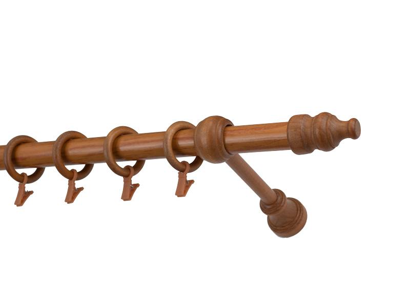 Koncovky, držiaky a krúžky sú drevené. Tyč je drevená (vyrábaná technológiou ako europrofily pre okna - čo eliminuje ohýbanie vplyvom tepla) a je potiahnutá odolnou drevoimitačnou fóliou. Dodávané sú v kompletoch.