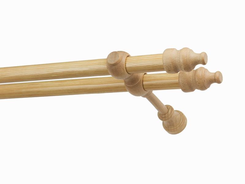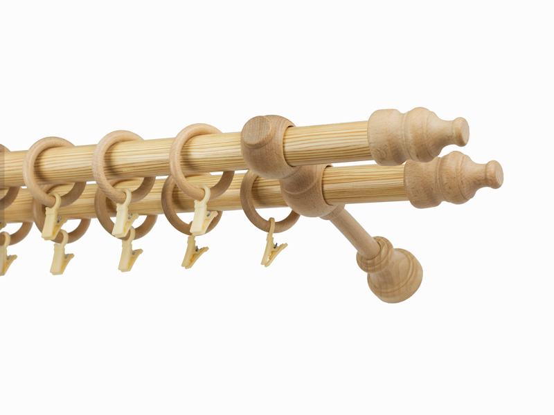 Koncovky a držiaky a krúžky sú drevené. Tyč je drevená (vyrábaná technológiou ako europrofily pre okna - čo eliminuje ohýbanie vplyvom tepla) a je potiahnutá odolnou drevoimitačnou fóliou. Dodávané sú v kompletoch.