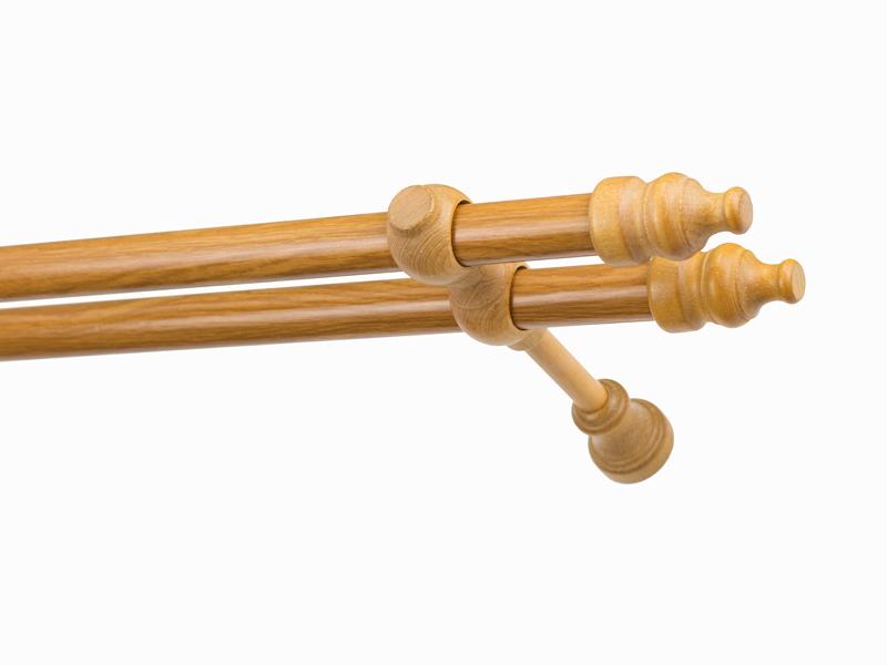 Koncovky a držiaky a krúžky sú drevené. Tyč je drevená (vyrábaná technológiou ako europrofily pre okna - čo eliminuje ohýbanie vplyvom tepla) a je potiahnutá odolnou drevoimitačnou fóliou. Dodávané sú v kompletoch.
